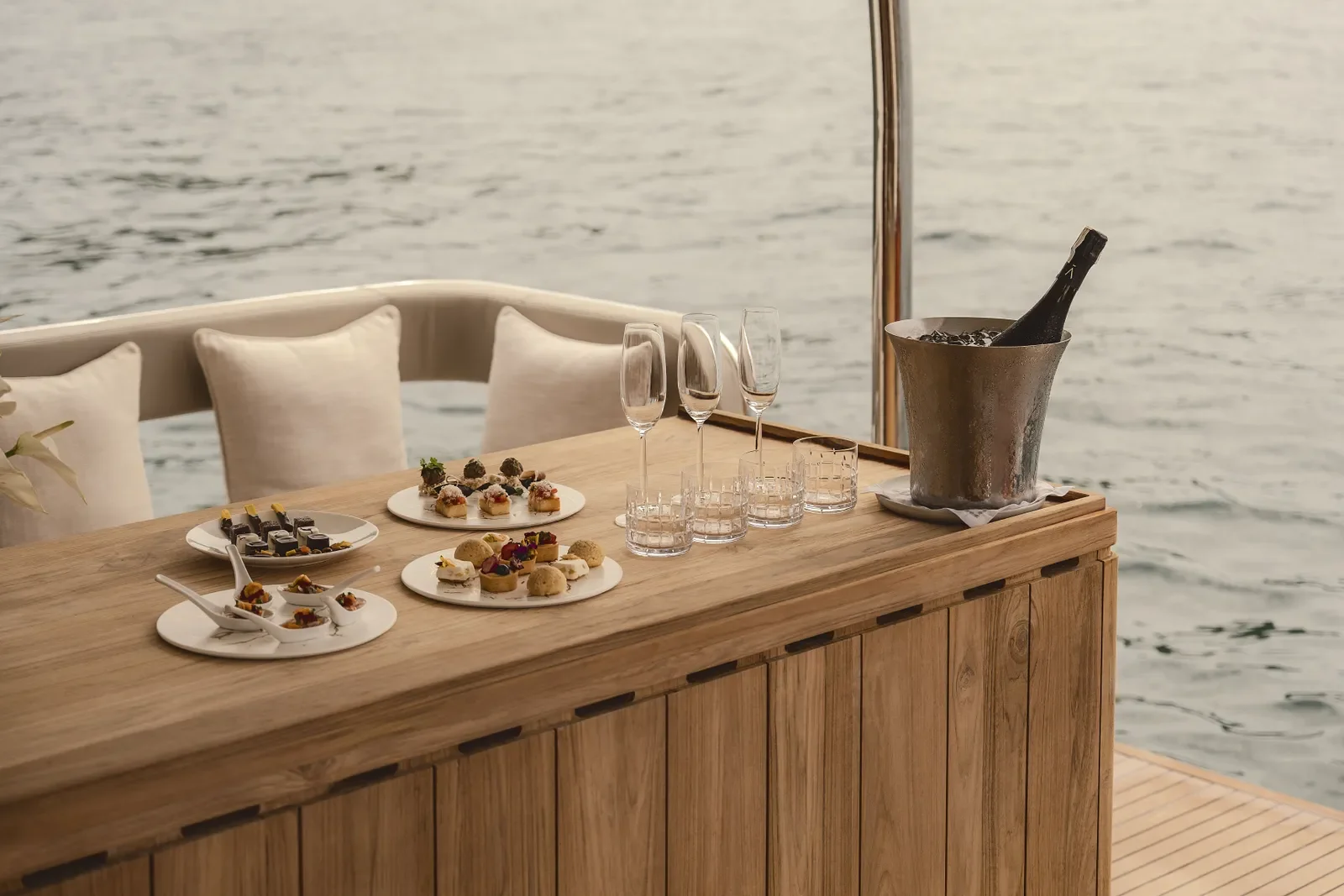 Accommodating up to eight guests, the residence can be configured with two or three bedrooms. A living room opens onto a vast sundeck overlooking the East Sea, while an open kitchen, wine cellar and alfresco dining terrace define the social heart of the space. But it’s the central pool — one of two on site — that becomes the go‑to gathering spot, inviting sunset dips and lingering conversations.