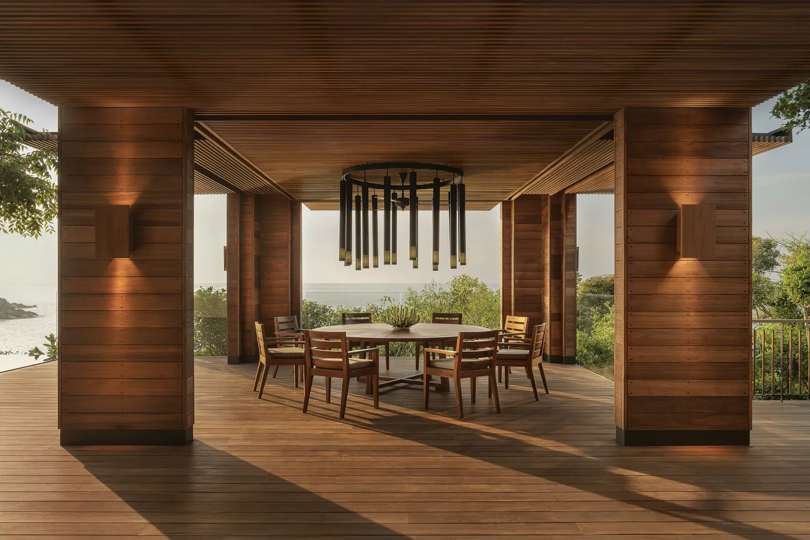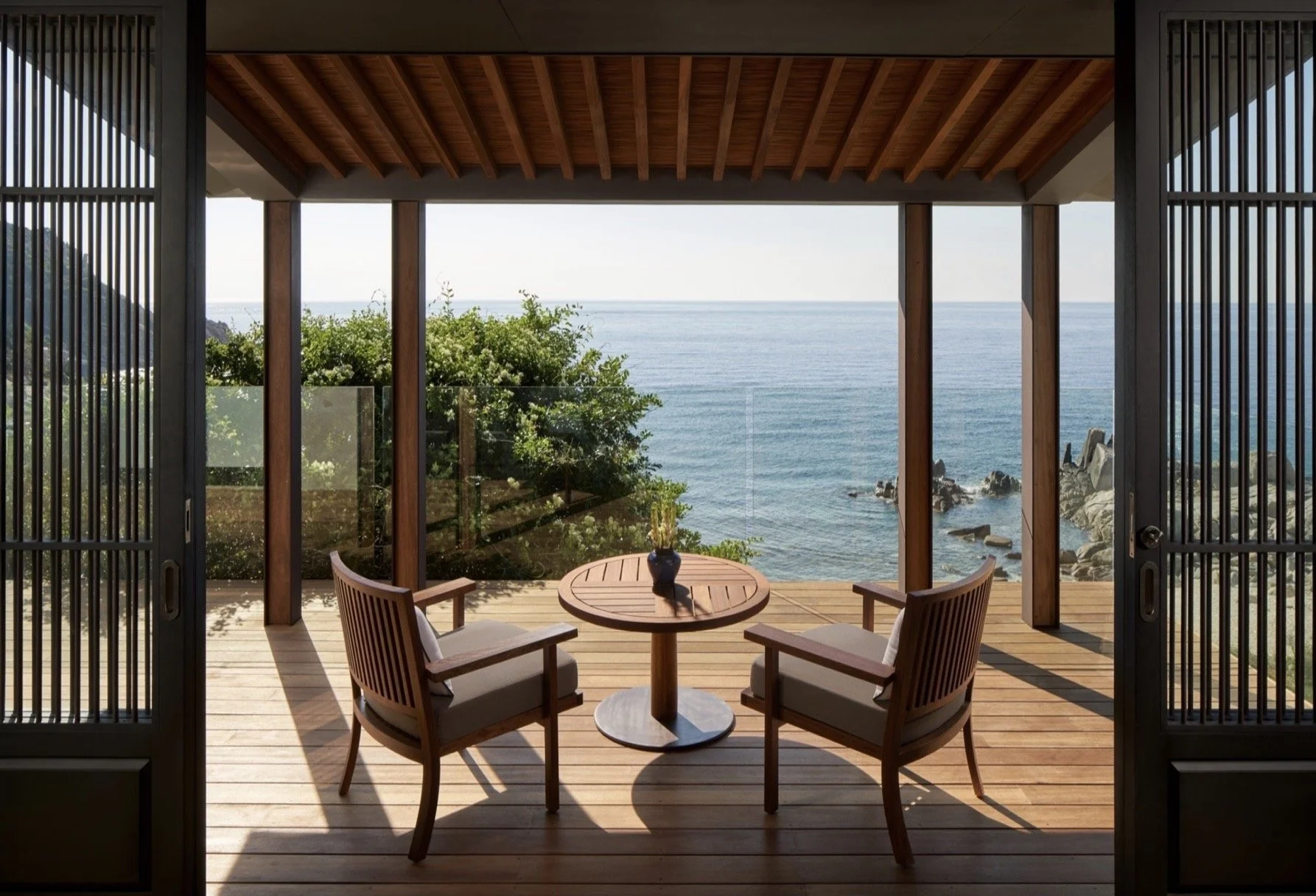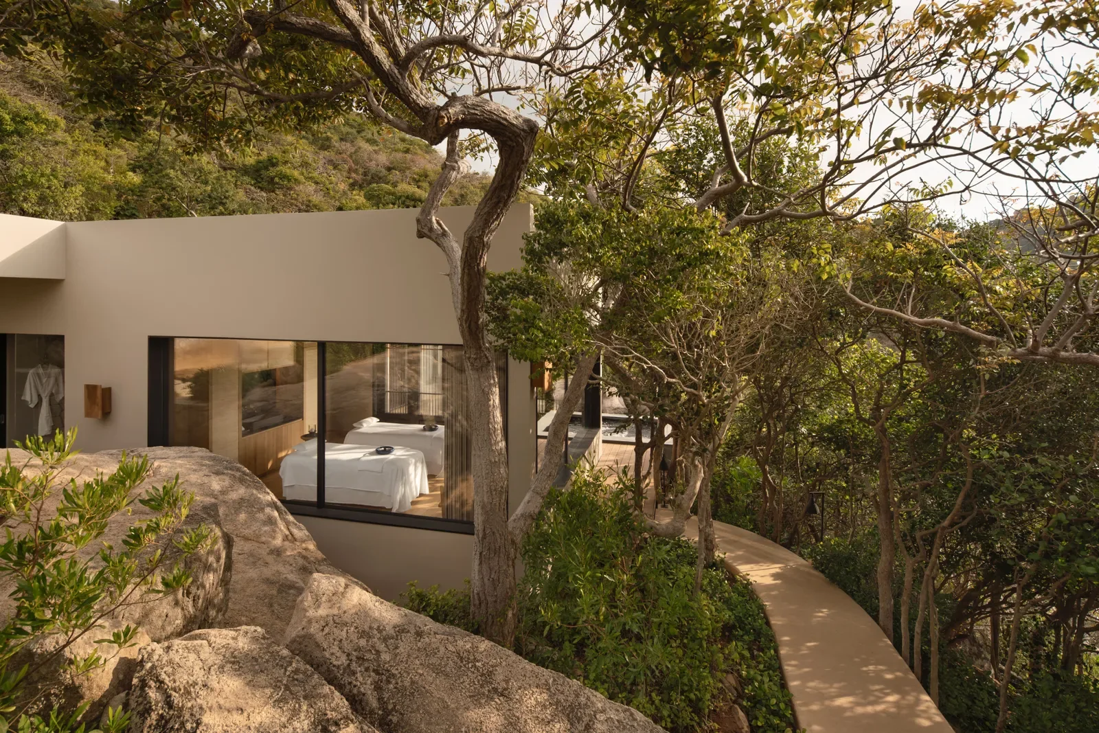 Conçue par Jean‑Michel Gathy, l’architecte à l’origine de nombreux projets Aman, la résidence de près de 1 000 m² mêle confort contemporain et intégration subtile dans son environnement. La lumière, les matériaux naturels et la végétation environnante composent un décor serein, en parfaite résonance avec la natur