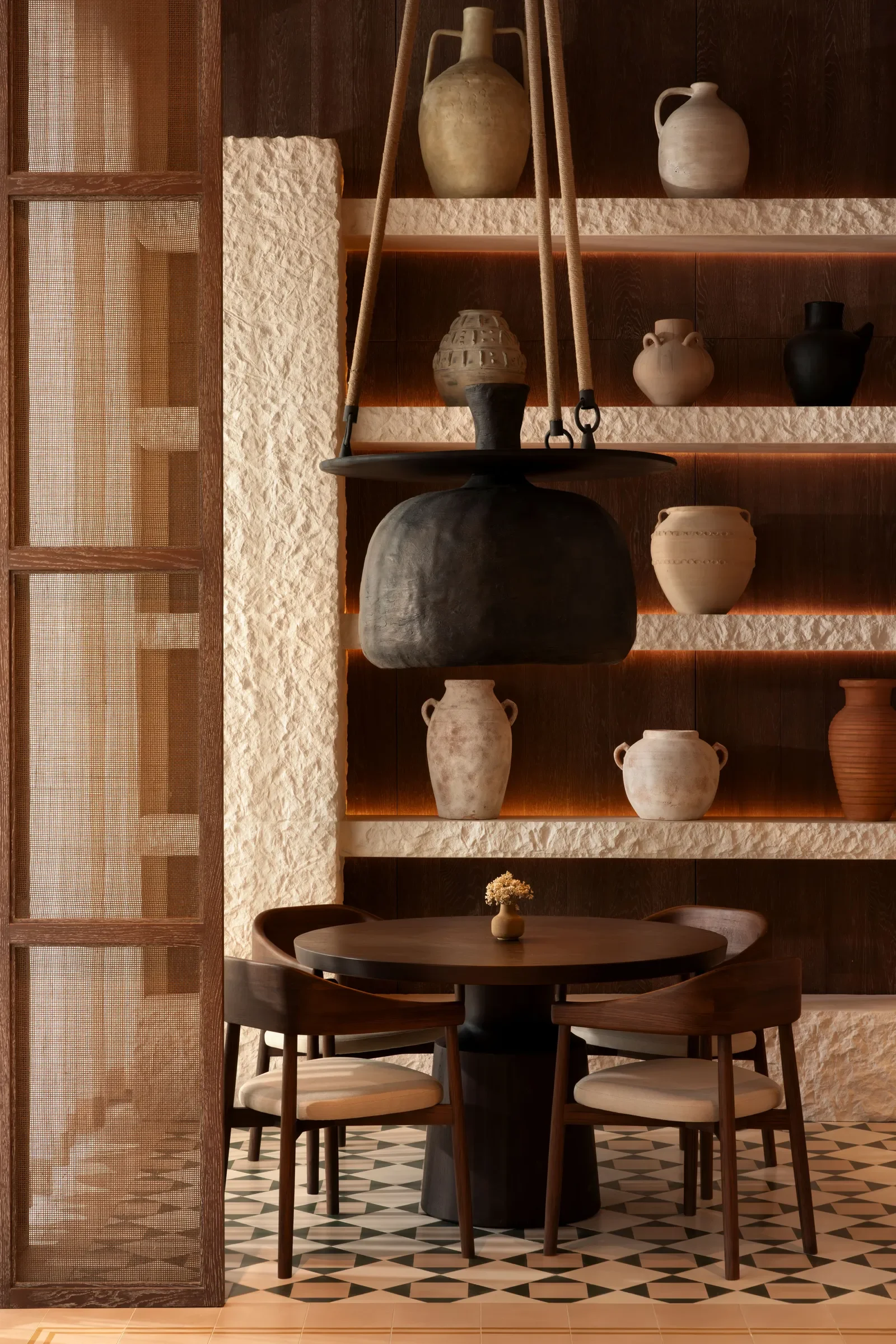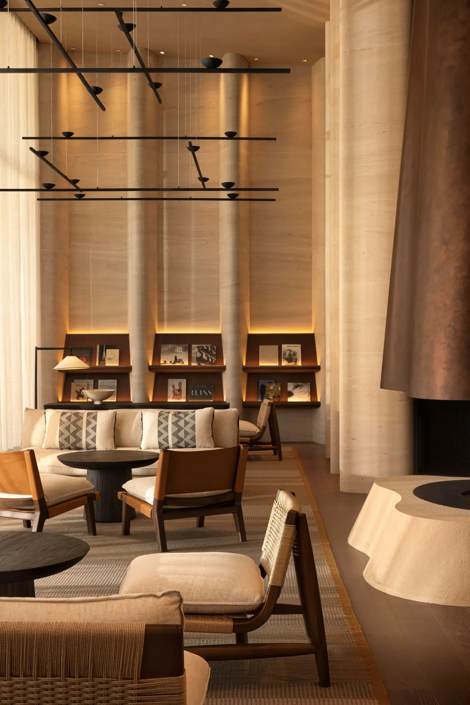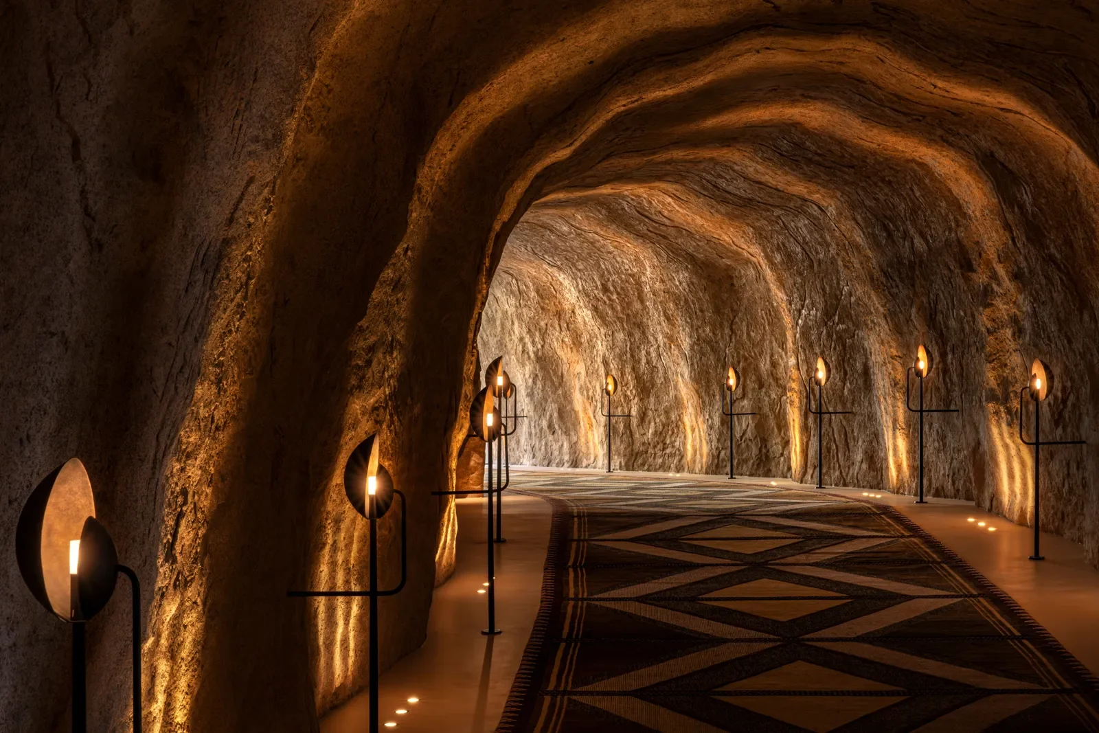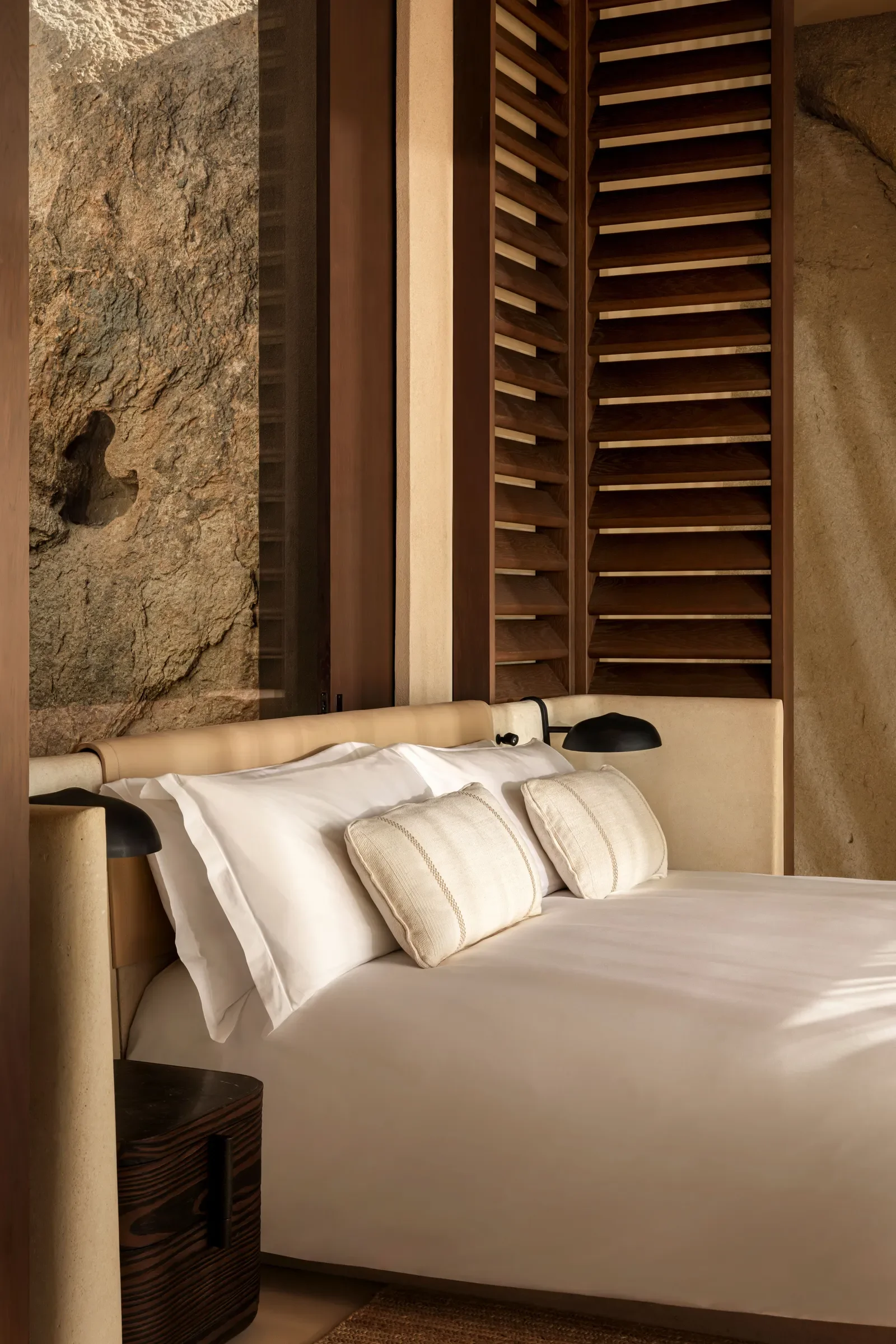 Interiors follow the same philosophy of quiet integration. Concrete, limestone, bronze and wood create a tactile palette that feels both ancient and contemporary, while exposed rock surfaces blur the boundary between inside and out. Light is controlled, views are framed, and every space recedes to let the environment take the lead.