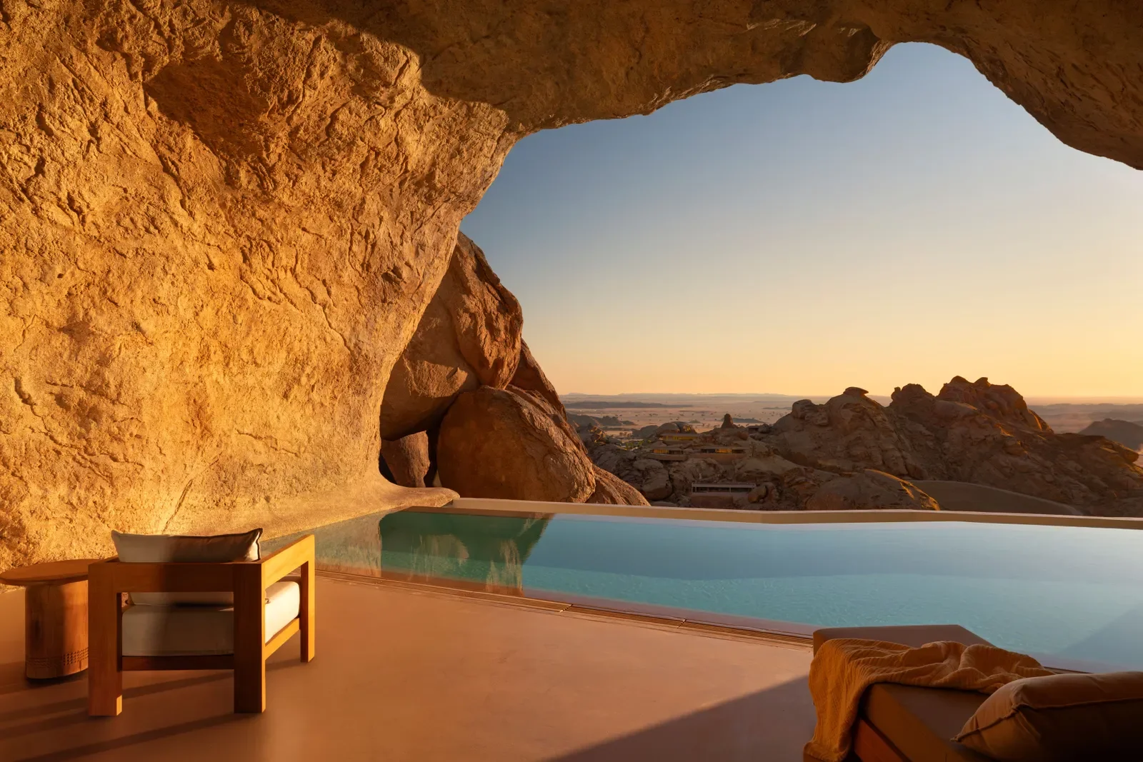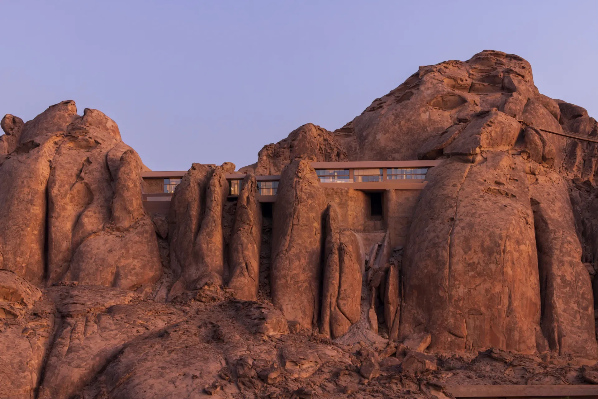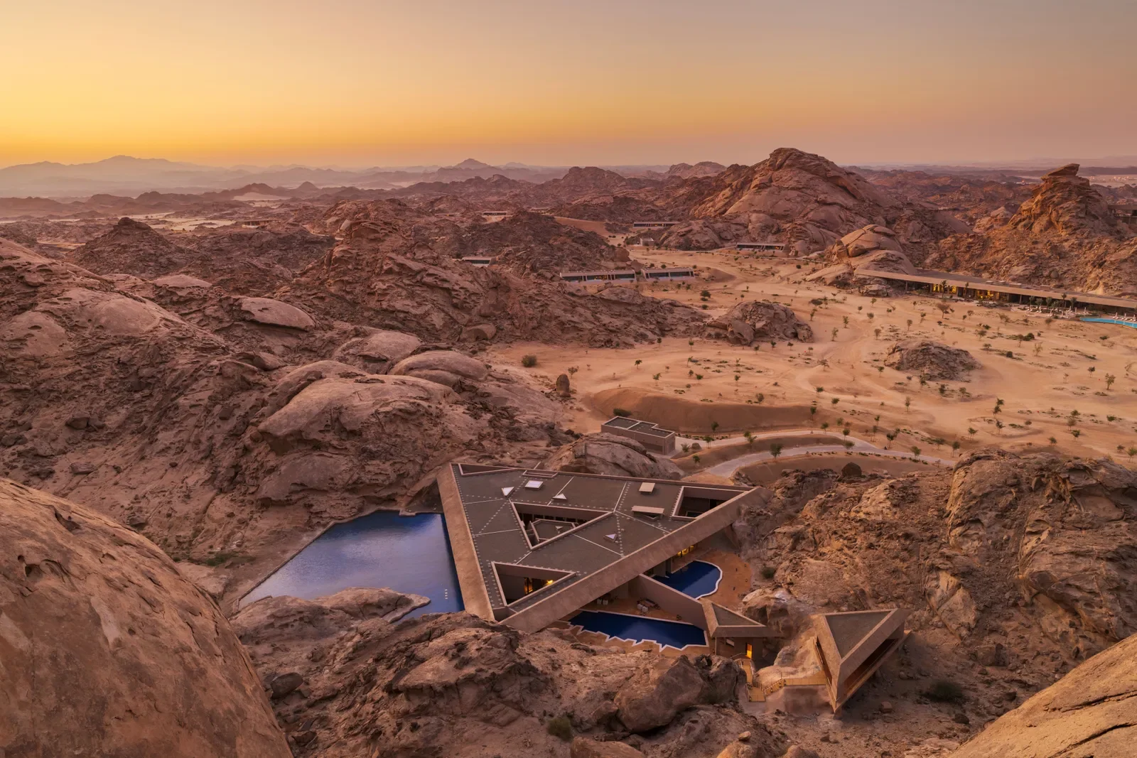 Set within the raw expanse of Saudi Arabia’s Hejaz mountains, Desert Rock emerges almost invisibly from a five-million-year-old granite valley. Designed by Oppenheim Architecture in collaboration with Studio Paolo Ferrari, the resort doesn’t sit on the landscape — it dissolves into it. Villas are embedded within the rock or suspended above dramatic crevices, turning the terrain itself into architecture.