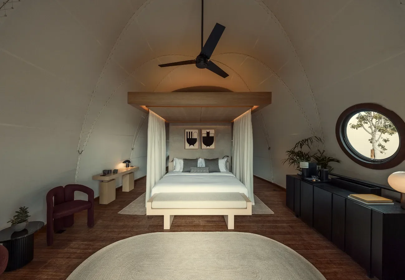 The 28 private cabanas redefine outdoor living. Each comes with its own plunge pool, shaded deck and generous openings that blur indoor and outdoor space. Inside, the aesthetic is warm and minimal, with natural textures and soft tones creating a calm, cocoon-like atmosphere. Despite their compact footprint, the spaces feel open, fluid and deeply connected to the landscape.