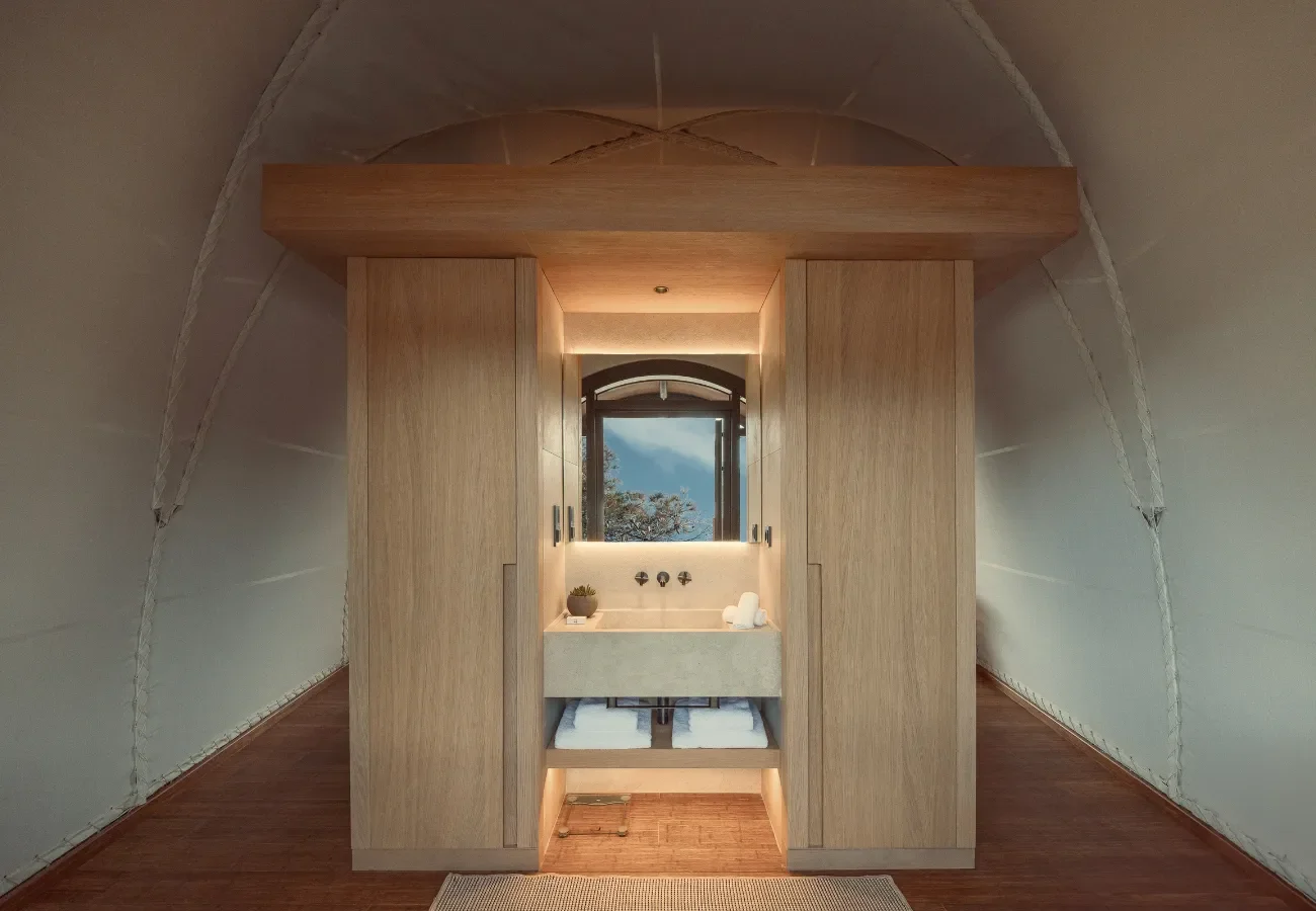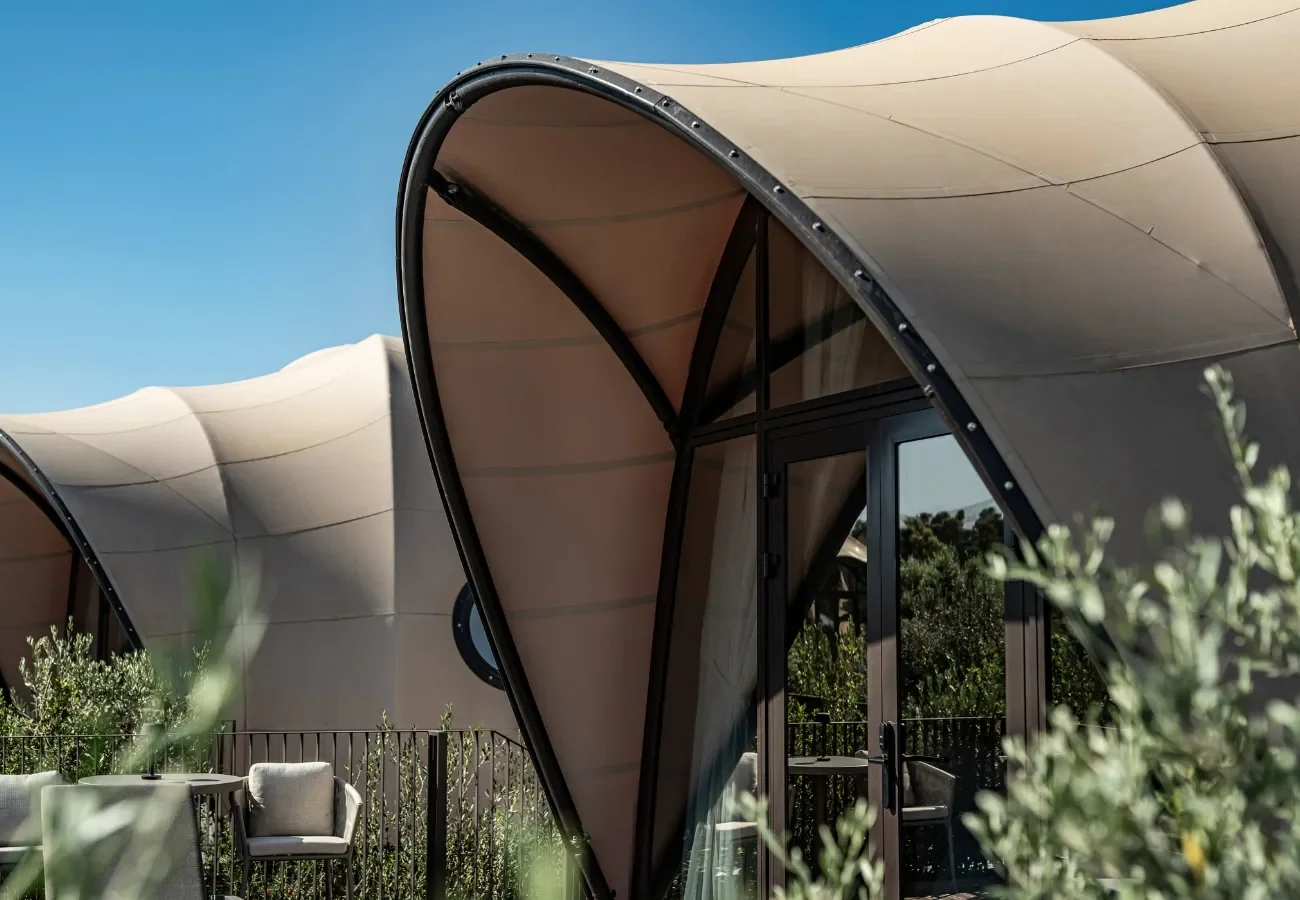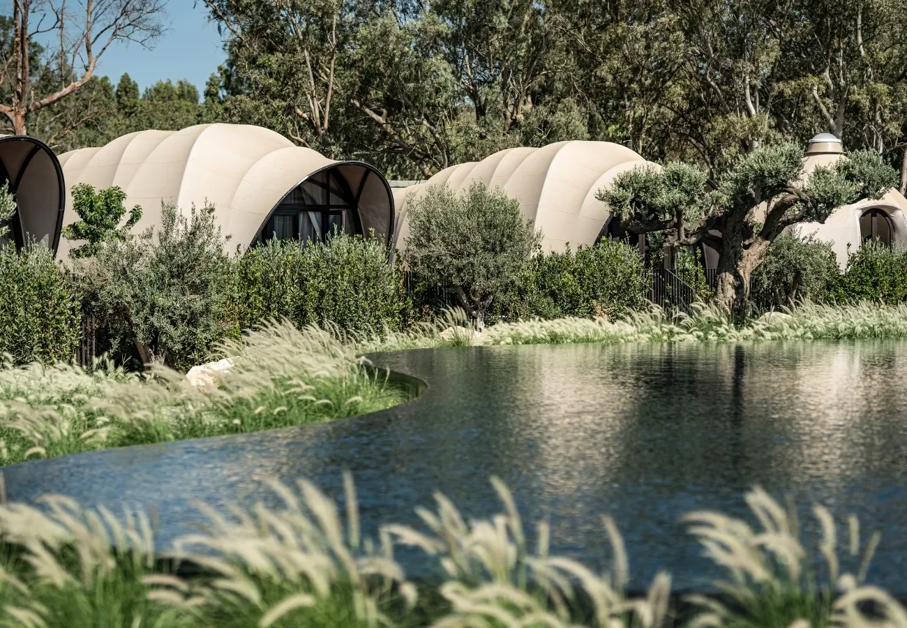 Part of the Domes portfolio, the resort unfolds as a collection of low, tented structures immersed in Mediterranean vegetation. The architecture is intentionally lightweight — designed to dissolve into its surroundings rather than dominate them.