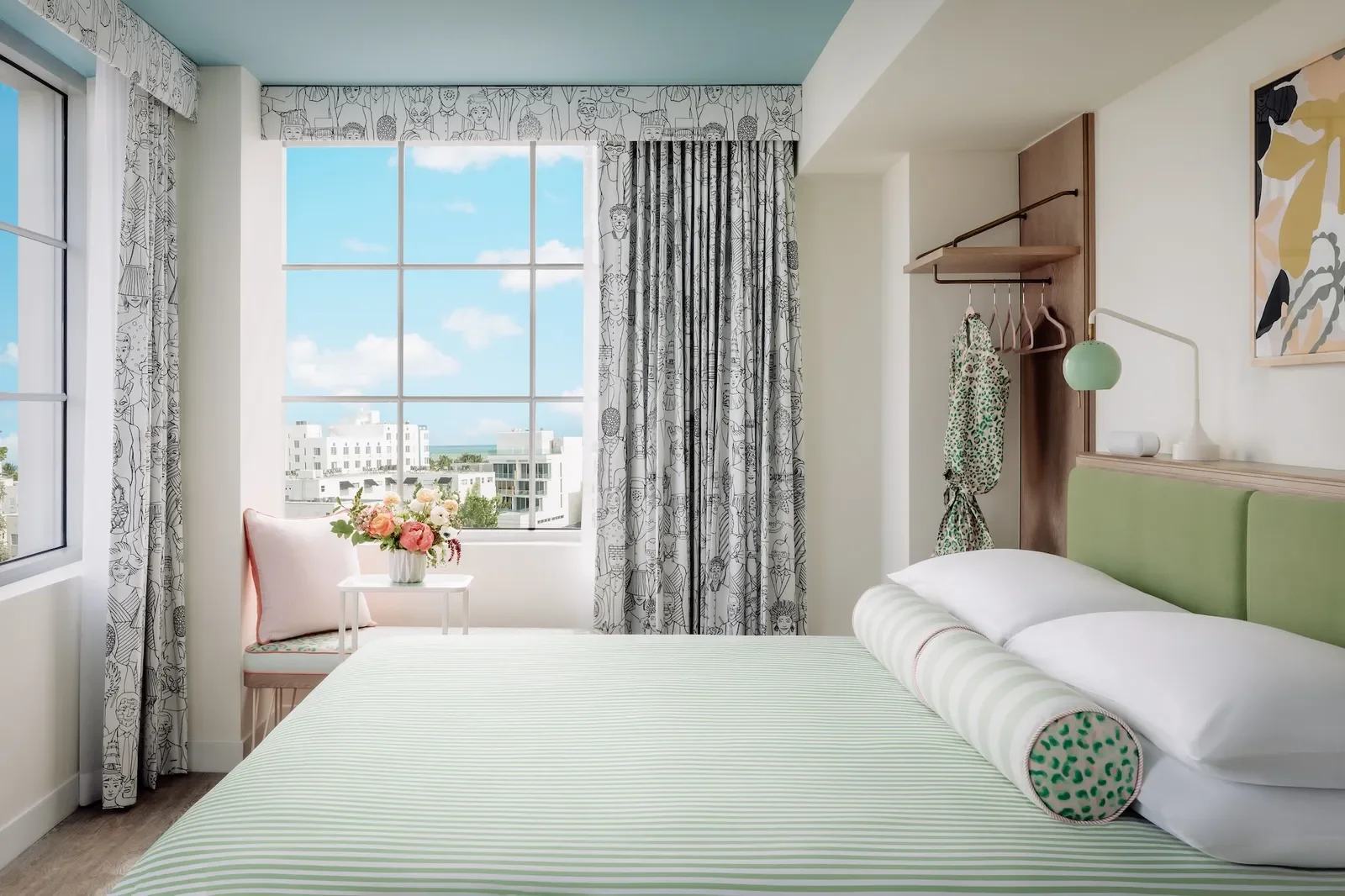 Rénovation art déco aux teintes douces, végétation luxuriante et palette monochrome font de cet oasis pour adultes un refuge apaisant loin du tumulte de Collins Avenue.