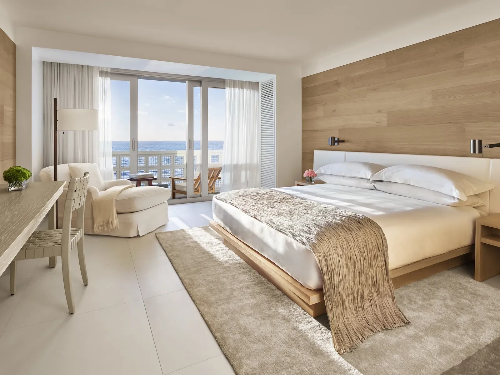 Minimalisme Mid‑Beach sculptural signé Ian Schrager : marbre, jardins intérieurs, spa, beach club et même une patinoire. Luxe discret et surprises ludiques.