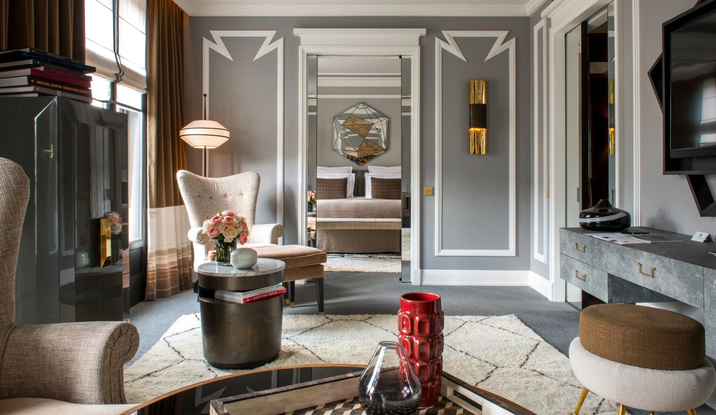 Guest rooms extend this sense of intimacy, with enveloping fabrics, handwoven rugs, and bespoke furnishings. The Hemingway Suite, filled with natural light and opening onto a balcony, feels like a suspended Parisian apartment — elegant, personal, and serene.