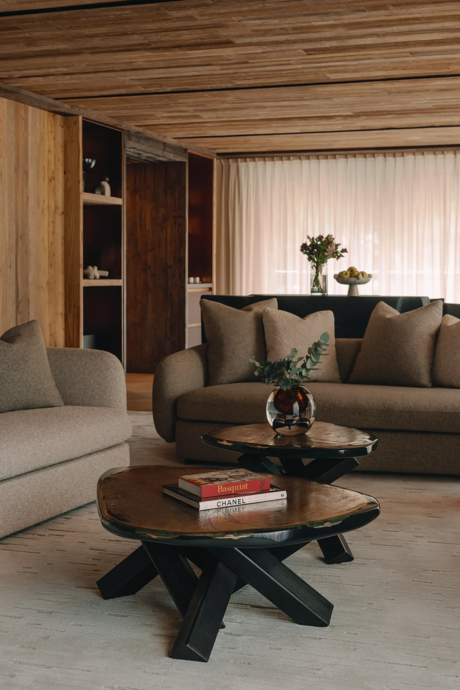 Tristan Auer conceived the interiors as a contemporary reinterpretation of Courchevel’s early alpine style. ‘Outside, everything is cold — snow, rock and light — so inside should feel like a comforting cocoon,’ he explains. The chalet‑like façade, crafted from Swiss quartzite with wood and copper accents, marries tradition with modernity throughout the property. Signature details, like sculptural suspended copper fireplace forms reimagined from historic alpine chimneys, echo mid‑century craftsmanship and rustic mountain warmth.
