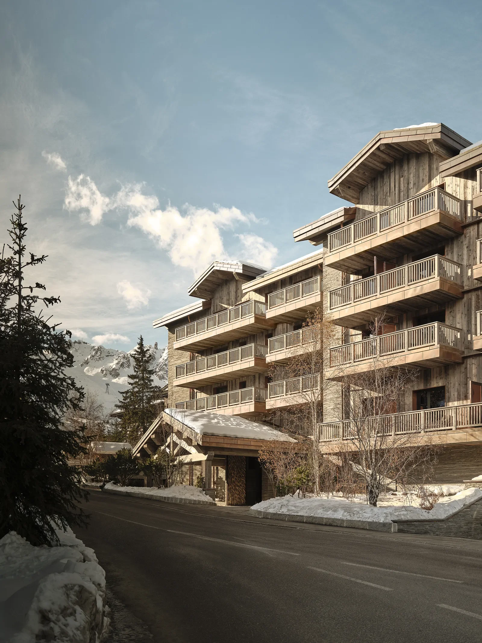 Tristan Auer imagine des intérieurs contemporains inspirés des débuts alpins de Courchevel. « Dehors, tout est froid — neige, lumière, roche — donc l’intérieur doit être un cocon réconfortant », explique‑t‑il. La façade, inspirée des chalets traditionnels et réalisée en quartzite suisse associée au bois et au cuivre, reflète ce dialogue entre tradition et modernité. Parmi les touches signatures, des cheminées suspendues en cuivre reprennent les formes sculpturales des anciennes conduites alpines, mariant élégance mid‑century et chaleur rustique.