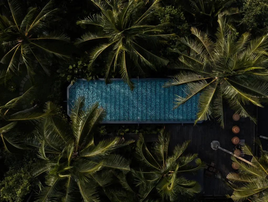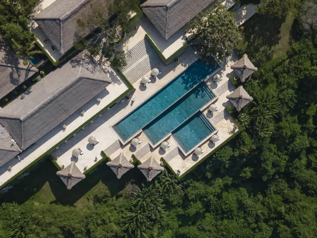 Nichée dans la forêt tropicale balinaise, Capella Ubud adopte une approche plus discrète. Ici, la piscine se fond dans son environnement, enveloppée par une végétation dense et une lumière tamisée, créant une atmosphère presque irréelle.