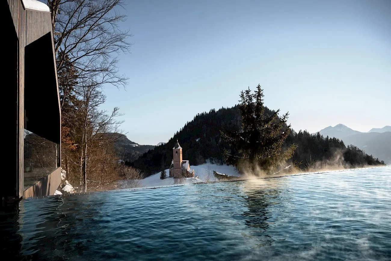Perché au-dessus des Dolomites, Miramonti Boutique Hotel offre une piscine qui semble flotter dans le vide. Les lignes pures contrastent avec la douceur du paysage montagneux, créant un équilibre visuel saisissant.