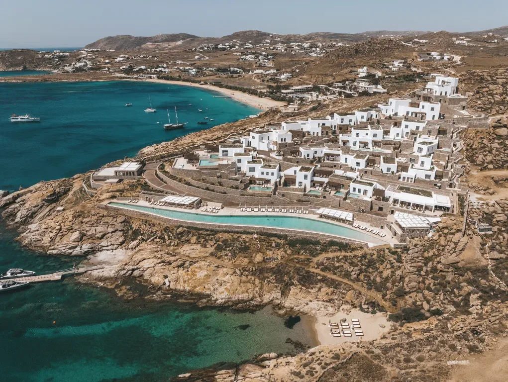 On a secluded stretch of coastline, Cali Mykonos offers one of the longest infinity pools in the Mediterranean. Hewn directly into stone, it feels less constructed than revealed, extending towards the sea in a quiet, almost elemental gesture. The effect is minimal, powerful — and deeply calming.