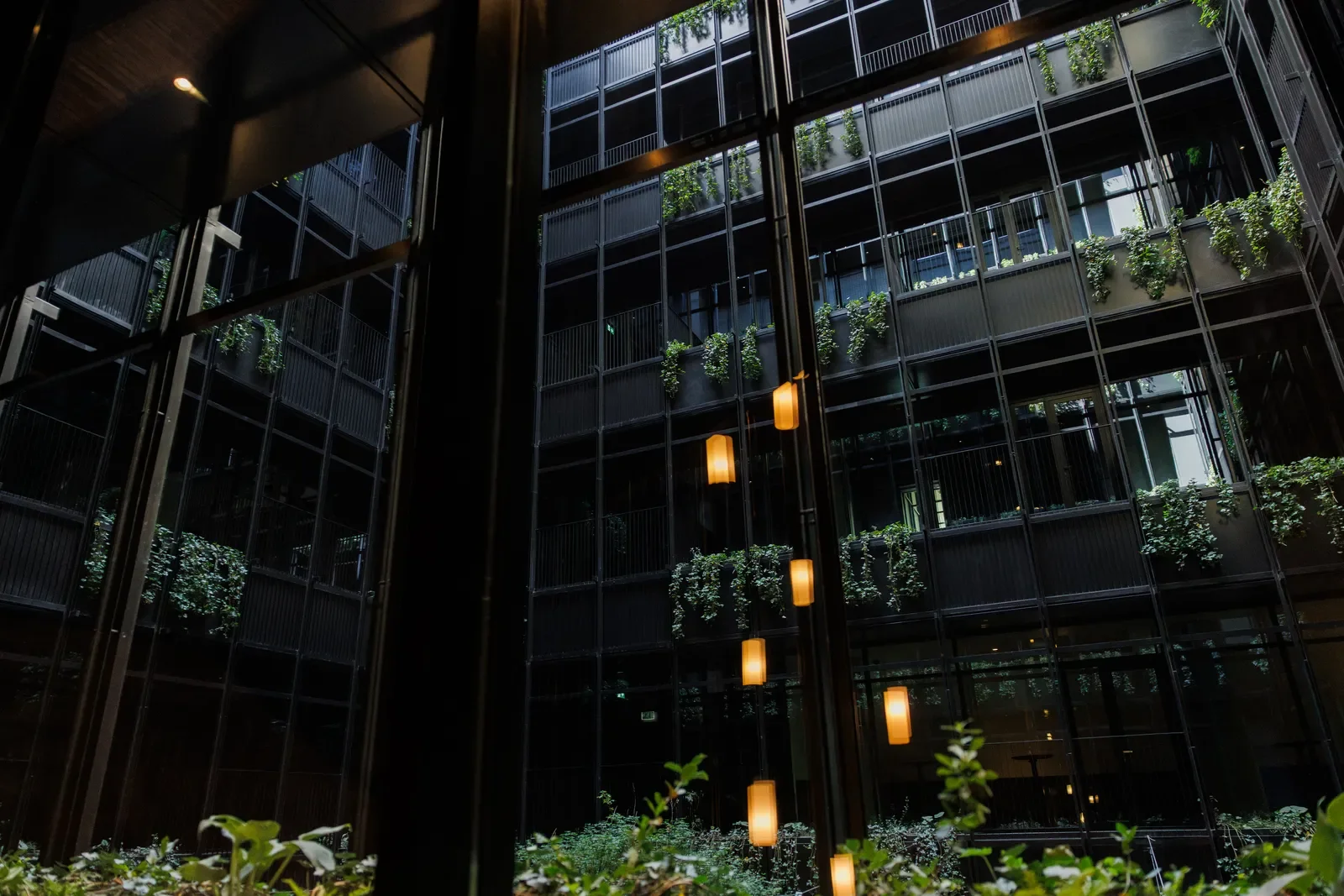 Au cœur du projet, une cour centrale s’ouvre vers le ciel, réinterprétation contemporaine d’une place urbaine. Une structure en acier inoxydable noir mat s’élève, adoucie par des cascades de végétation, tandis qu’au niveau du sol, un bar redonne vie au lieu — on y sert des cocktails précis, comme un lemongrass-midori sour, dans une atmosphère à la fois brute et vibrante.