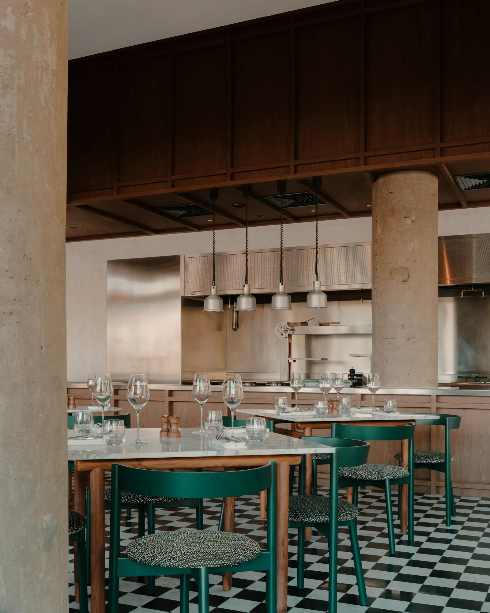 Au rez-de-chaussée, un réseau de couloirs habillés de travertin évoque les ruelles de la ville, menant à une constellation de restaurants et à une bibliothèque de vins, organisés autour d’une cour centrale — un espace vivant, pensé comme un point de rencontre.